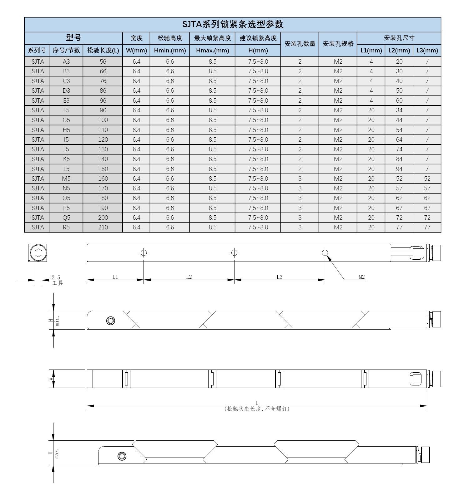 这款SJTA系列锁紧条采用优质铝合金制成,具有高强度、抗振动和防松脱性能。其标准宽度为6.4mm,自由长度可调(56-210mm),并配有M2安装孔,非常适合用于紧固PCB板、坚固的机箱模块和工业设备组件。该产品支持定制尺寸和表面处理(阳极氧化/喷砂),广泛应用于工业控制、通信和服务器机箱领域。